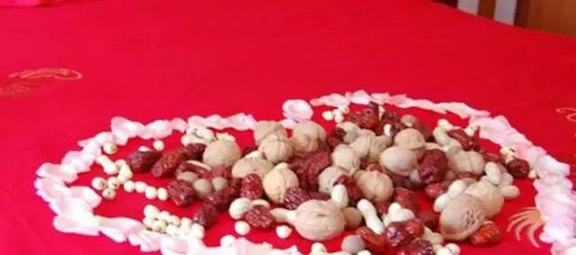 六、鋪床的流程:鋪床過(guò)程根據(jù)各地風(fēng)俗不同略有差別,老一輩都知道,一般鄰居中都有這樣的人。主要流程除了掃床、鋪鴛鴦?wù)?、龍鳳被之外,就是“撒帳(撒床)”了,將花生、桂圓、蓮子、栗子、棗等干果鋪撒在婚床上,取義“早立子、蓮生子、花生子(兒女雙全)”的祈愿。